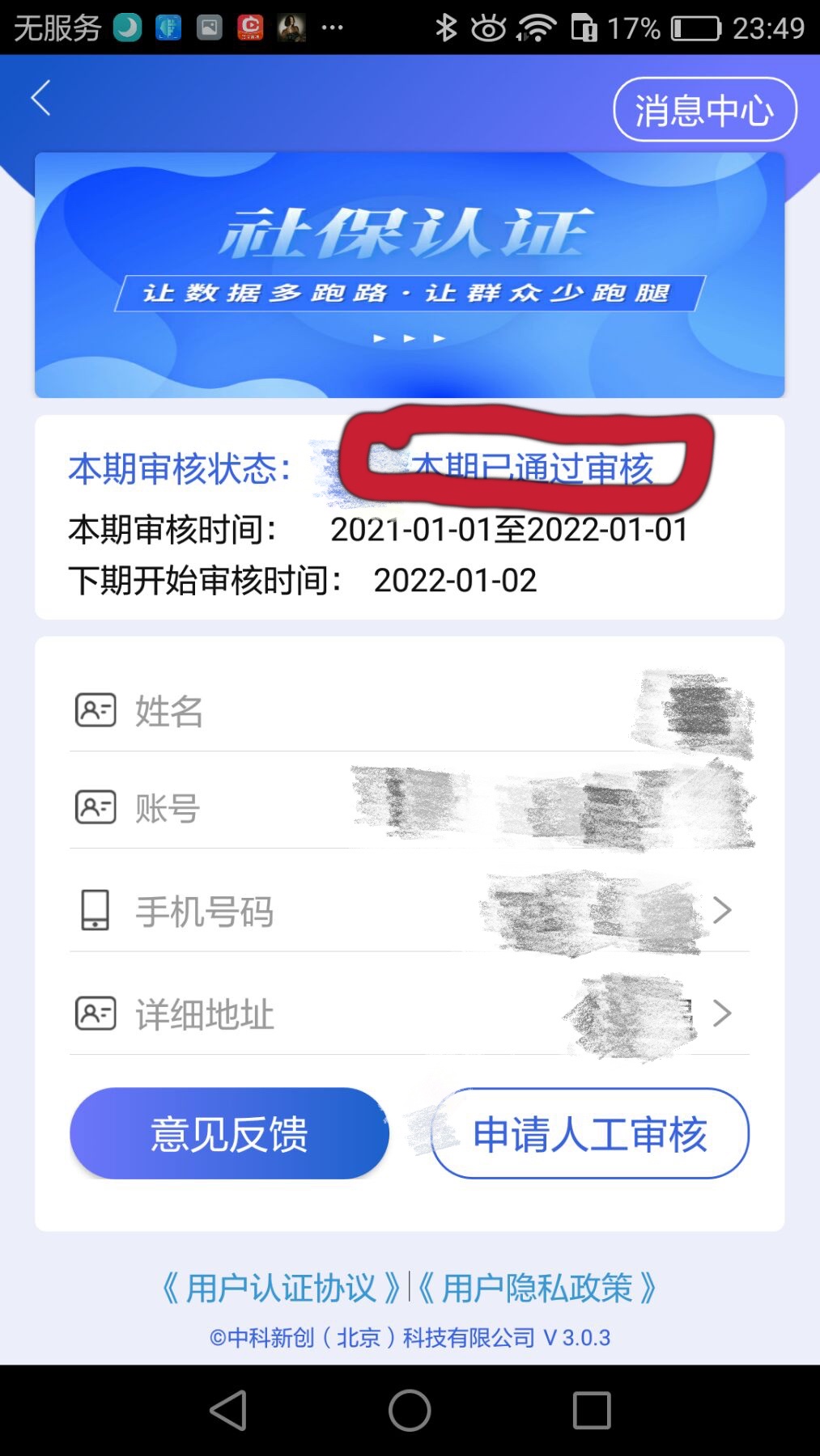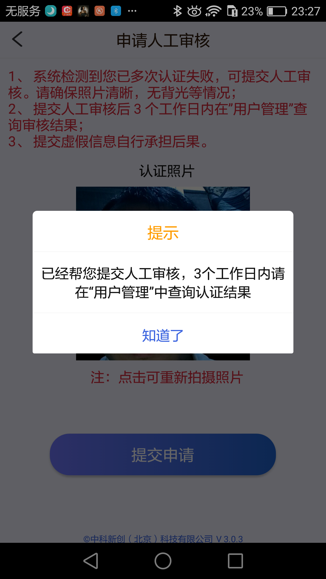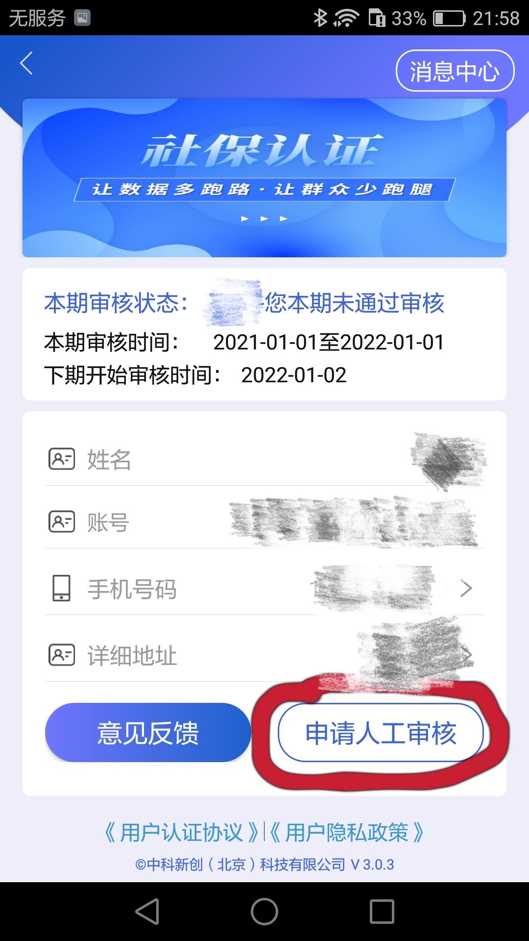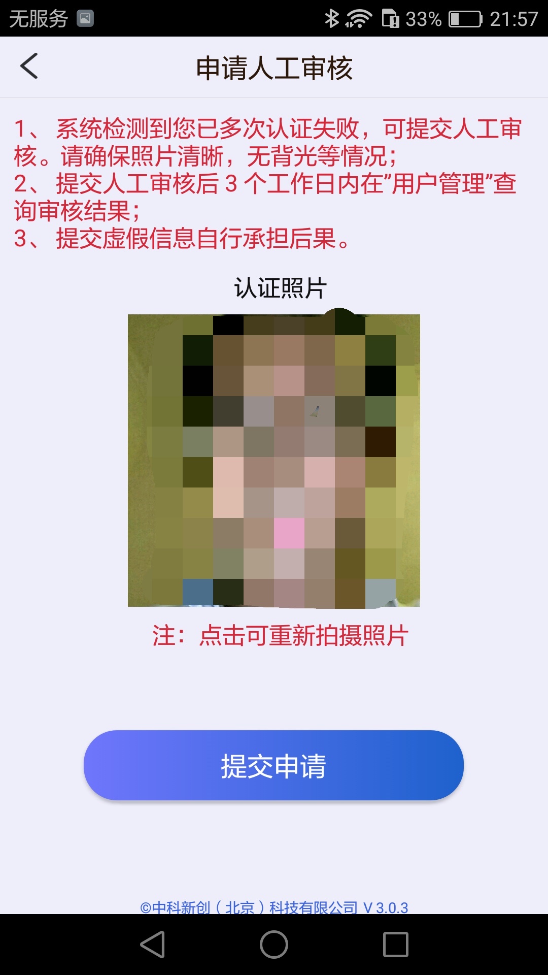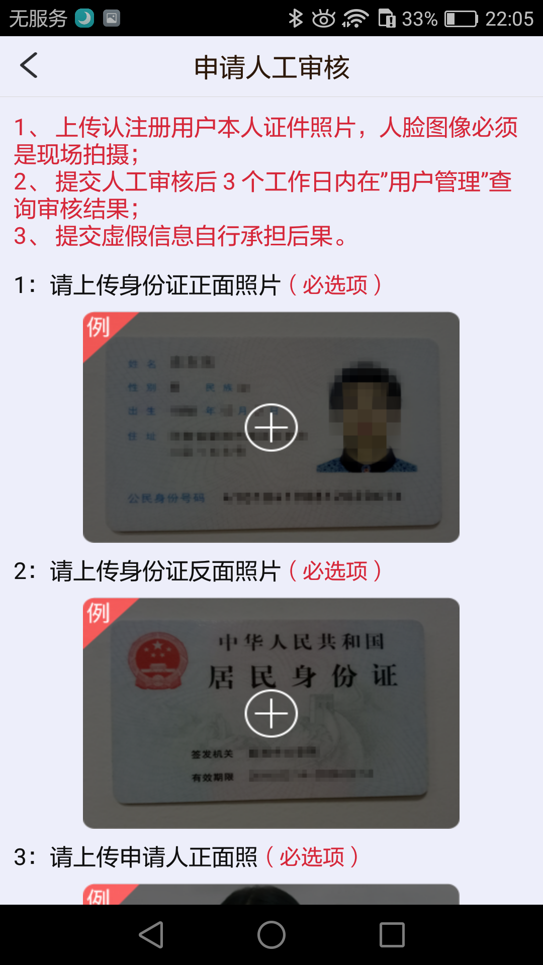 答:App的用户管理点击“申请人工审核”,按要求拍摄身份证正反面照片、本人照片、输入联系电话、写入需要人工审核的理由,就可以提交申请了,申请提交后的3个工作日内,工作人员将在用户管理的“消息中心”回复人工审核结果。